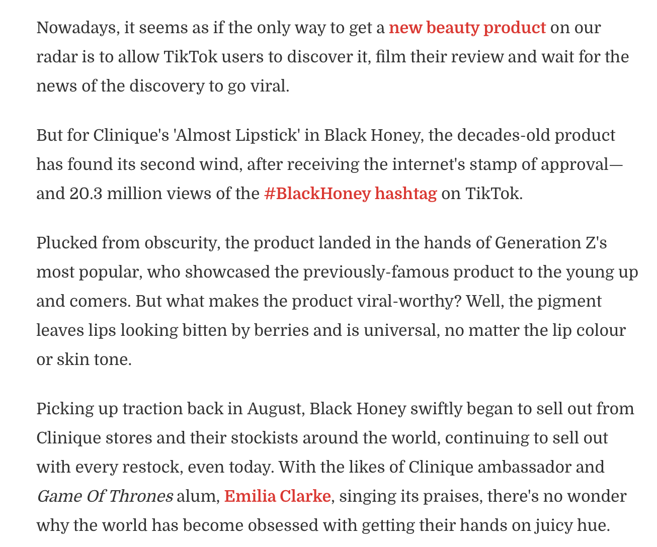 Black Honey was first launched in a gloss pot. In fact, Clinique founder Carol Phillips named it Black Honey because the texture of the gloss looked like a yummy, gooey pot of honey. Yes, that was the '70s. Black Honey had a second breakthrough moment in 1989, when it debuted as what it is now: Almost Lipstick in Black Honey. At the time, women were juggling careers, family, and chasing their dreams more than ever; convenience was key. And the makeup trend was full-coverage, intense color. Here came an alternative and a solution. Almost Lipstick put flawless Black Honey color in a sleek, chic tube that could fit in any bag and be applied in a flash. A cross between gloss and lipstick, Almost Lipstick feels incredible to wear, has shine but isn't sticky, and gives lips that just-ate-a-plum look while being easy to wash off.