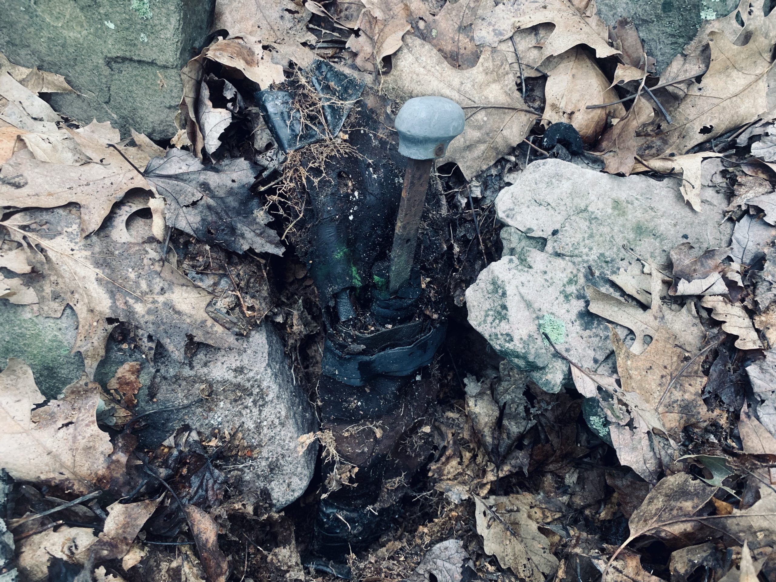 The top of the hilt was the only thing visible; the knife had been stuck into the ground, wedged between a couple of rocks. The way you'd hide something if you meant to come back for it later: inconspicuous, but not completely invisible. It's on the far side (from us, toward the valley) of the higher ridge, near a stand of old sassafras trees where I sometimes dig sassafras roots, so it's tempting to think the knife had something to do with that. But more likely it was used by someone poaching deer.