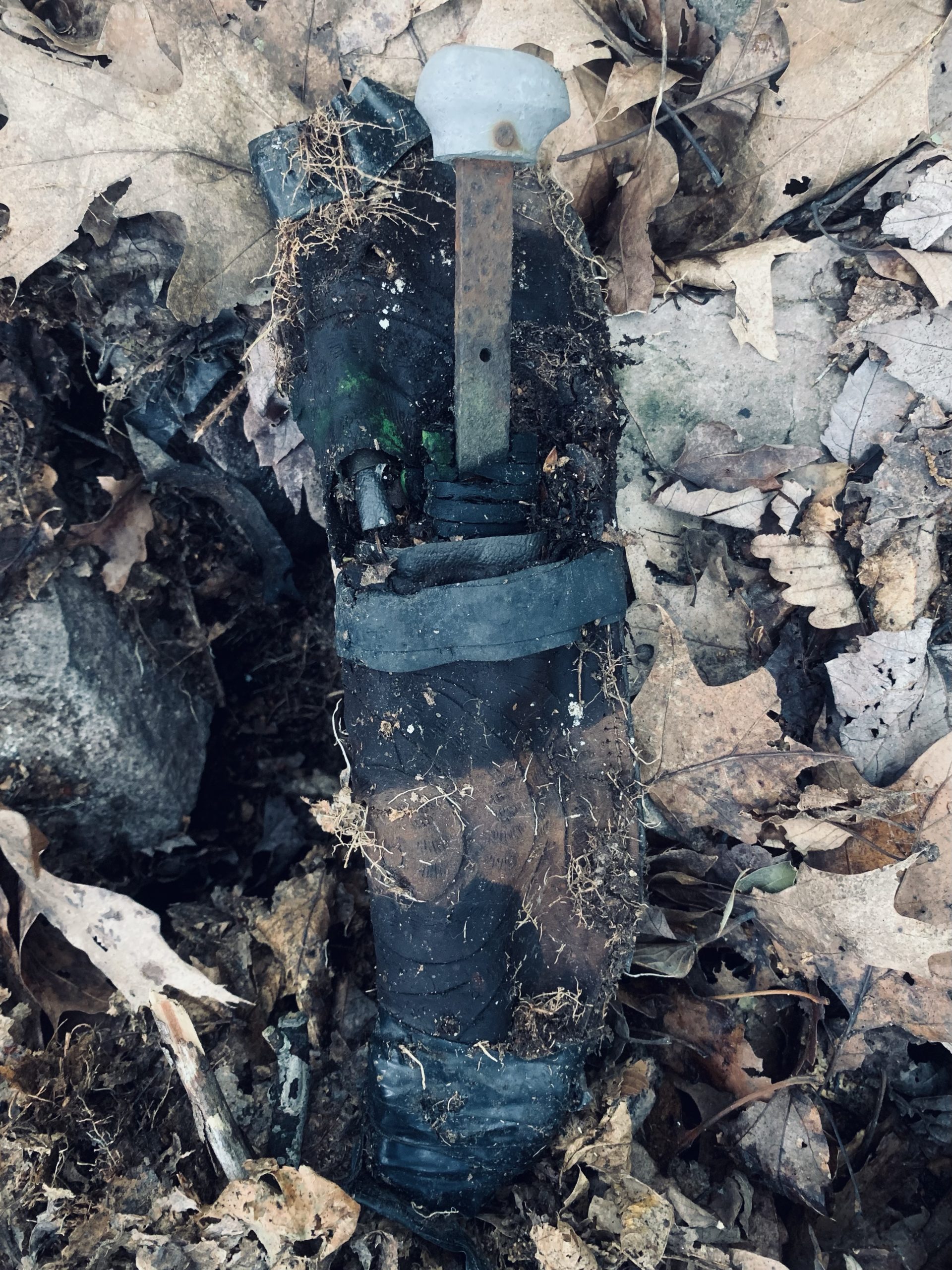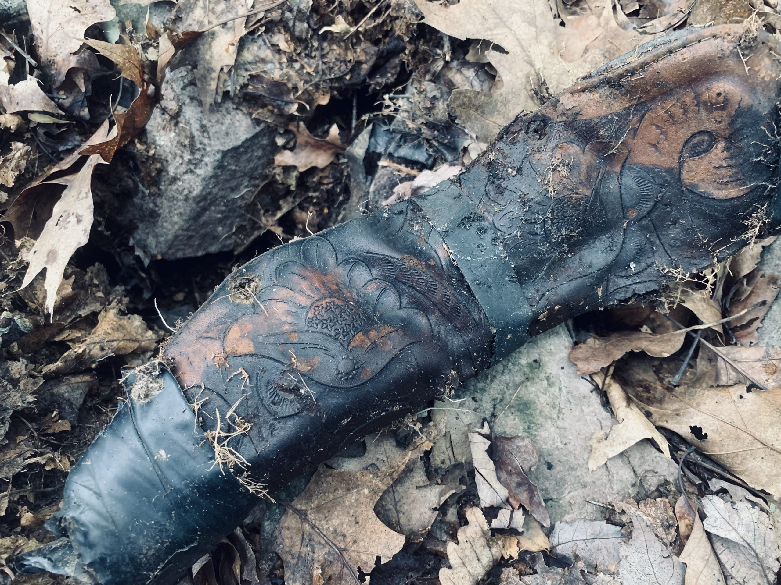 I found a knife in the woods. Or more accurately, I found an old, tooled leather sheath for a knife with the remains of a hilt sticking out of it.