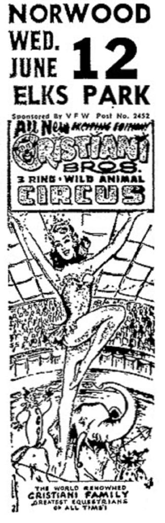 Equally important is the training of the ring stock. A circus ring is 40 feet in diameter and to keep from throwing a performer off balance a horse must take just so many measured steps. The gait must be mathematically uniform. A serious injury to a performer might result if a horse stumbled. Among the 100 performers with the Cristiani Bros. circus coming to Elks Park, Norwood, on Wednesday,June 12, under the auspices of the V.F.W. for performances at 3 and 8 p.m. are 20 riders.