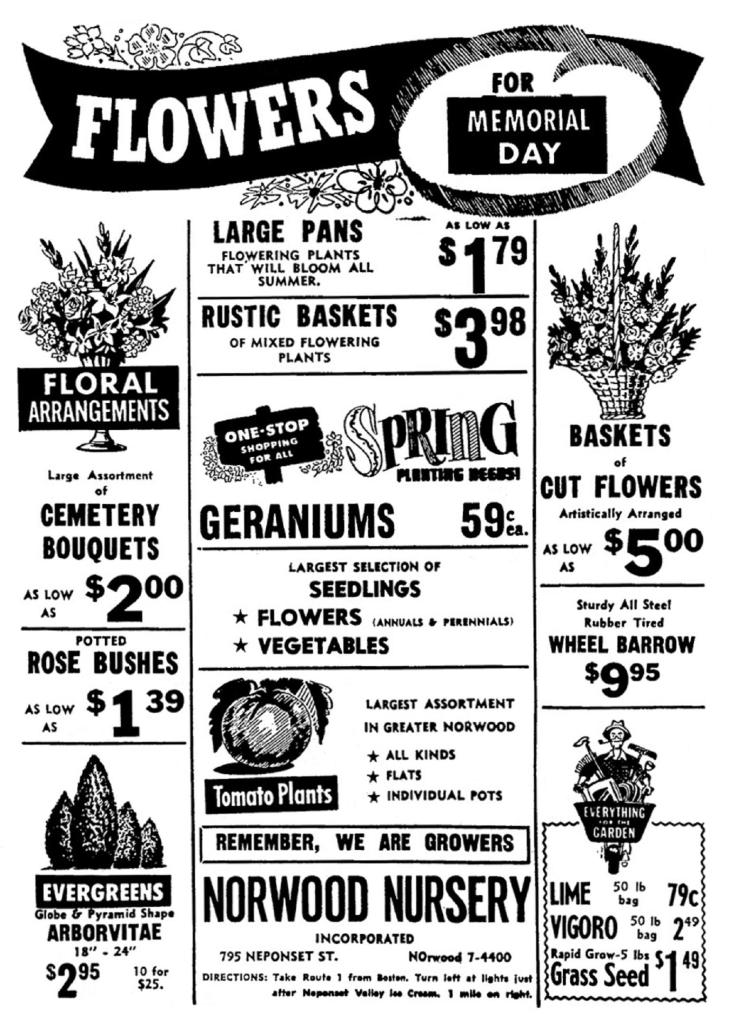 World War II veterans Ralph Neilsen and Albert W. Whitmore Jr., owners and operators of the Norwood Nursery on Neponset Street on the road to Canton, have been working from Sun up to sun down for the past several weeks getting their stand ready for the Memorial Day trade and announce that they have a complete stock of potted plants, flowering annual«, vegetable plants, evergreen trees and perennials now on display.