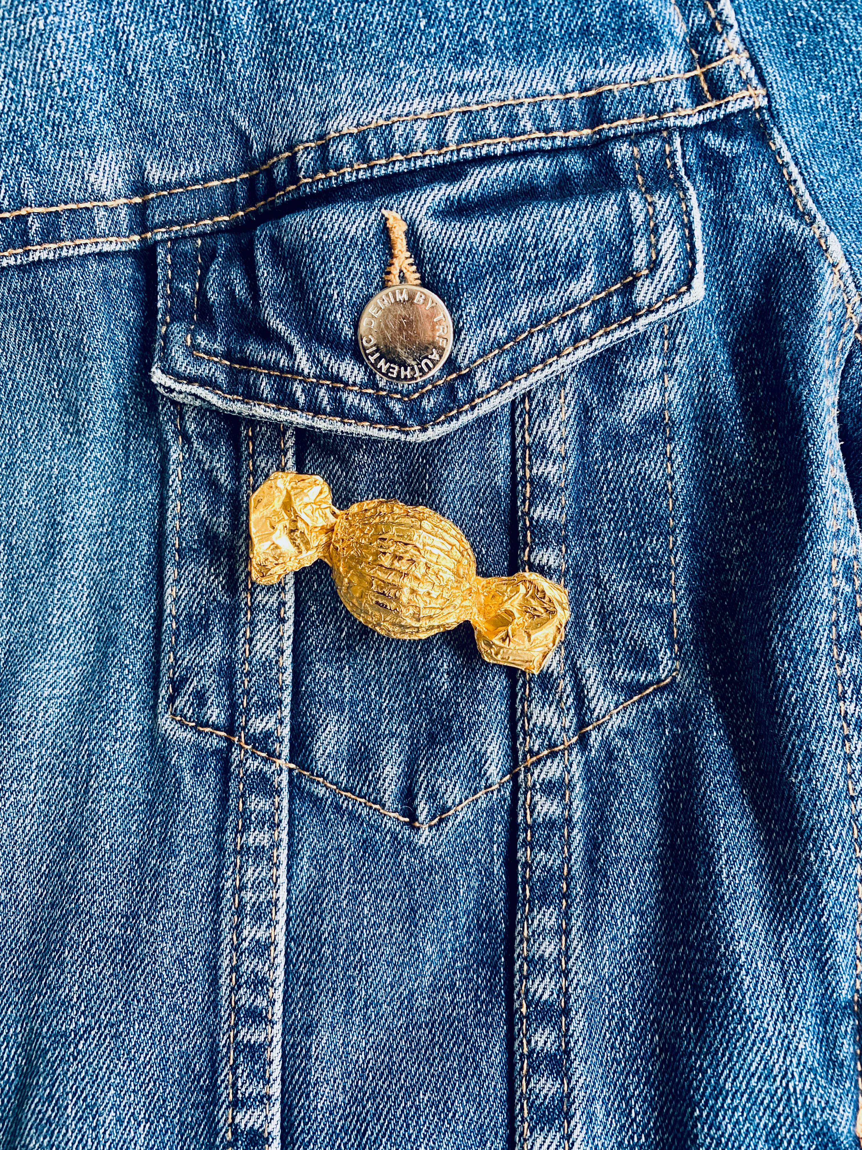 I have been wearing this gold-coloured sweetie brooch on my denim jacket. I love the idea of brooches. I love looking at brooches - they are often like both jewellery and art. But for some reason I almost never wear them. There are so many lovely gorgeous brooches available in antique shops, probably because no one buys them them anymore.