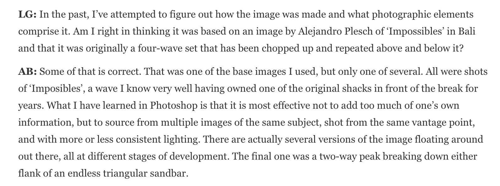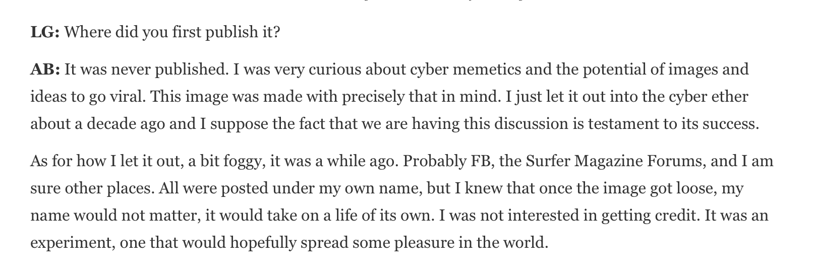 Read the complete (very interesting) interview here. The part that stayed with me was that Bickerton was originally credited on the photograph, but - as usually happens - that credit fell away and in the end people didn't even bother to check who the creator was.