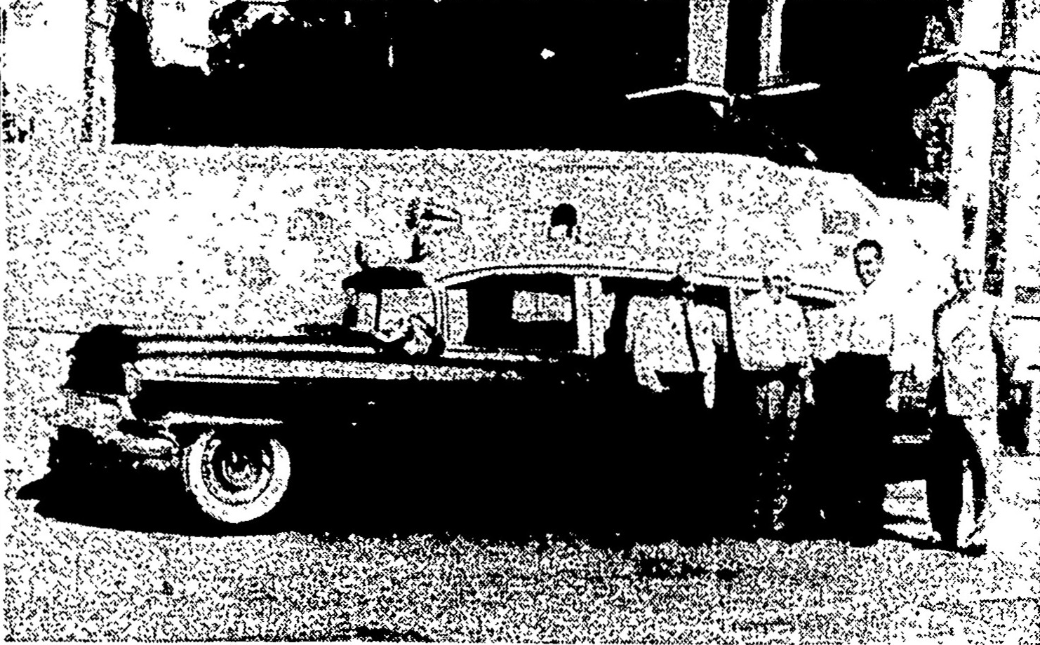 NEW AMBULANCE ARRIVES—The new Cadillac ambulance was delivered to the Town of Norwood on Tuesday. It Is the first air-conditioned ambulance In New England and boasts the very latest equipment. Police Chief Mark Folan, second left, accepts keys to new vehicle from John J. Sullivan of the Meteor Salos of New England, At left Is Fire Chief Harry Butler and at right General Manager John B. Kennedy. (McLean Photo)