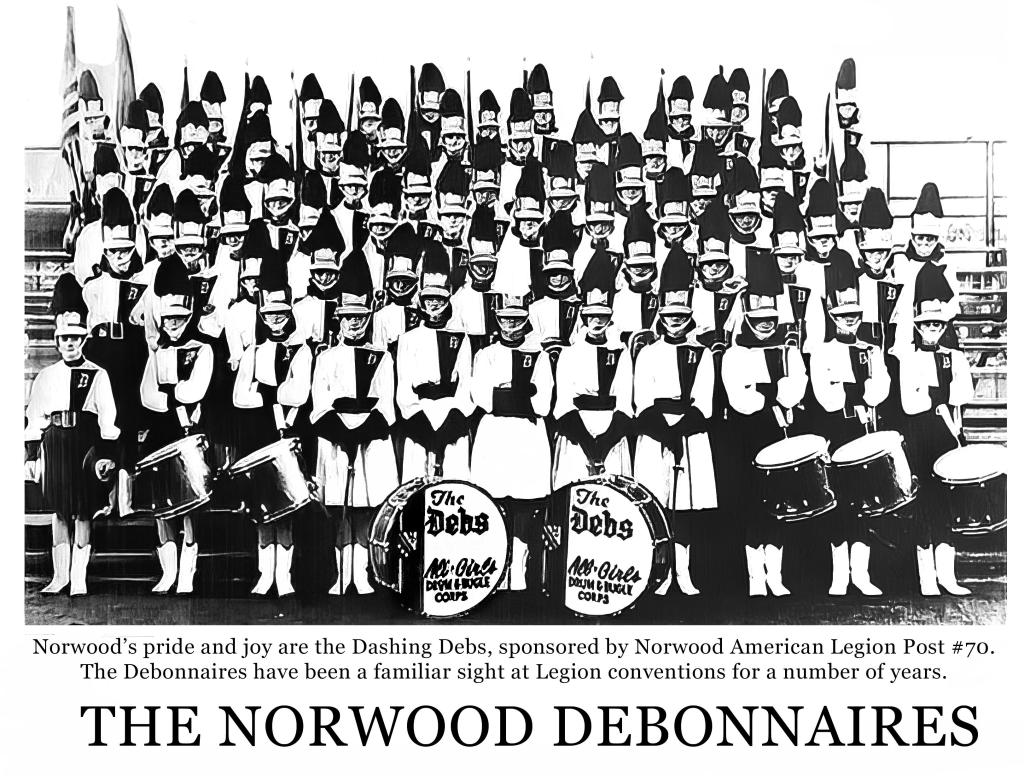 The Debs, with their hard work, and precision drills made it all look easy. Hard work and dedication to the corps and each other as part of the whole, as their outstanding musical skills brought accolades to them wherever and whenever they performed. They learned skills that carried them throughout life and made friendships and memories that never fade. In speaking to the many women who as girls were Debs, they will tell you that it was one of the best times of their lives. Besides all that they earned to enrich their own lives, they brought fame and notice to the town of Norwood, and truly were our pride and joy.