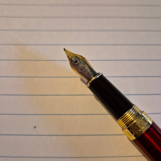The author sat at her desk, pen in hand, gazing down at the