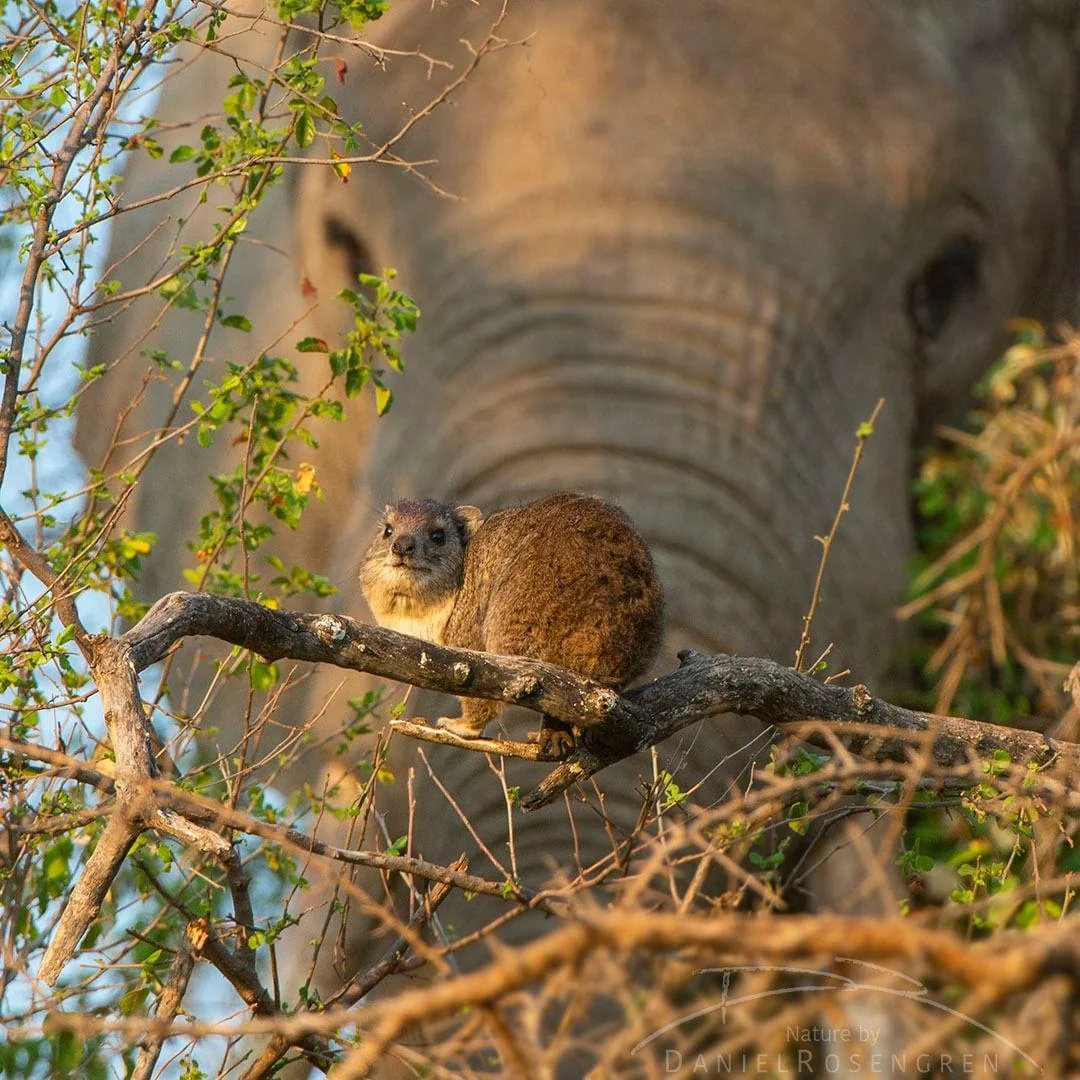 The hyrax (called a dassie in South Africa) is the closest living relative of the Afrian elephant. It looks like a large rodent but the close evolutionary relationship is deduced from similarities in the structure of the feet and teeth.