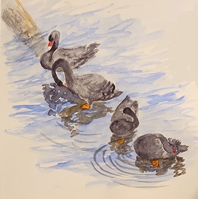 Life by the River It's been raining for days and the river is up...really up. It's flooded the park and jetties at Franklin and the road leading to Cygnet. Our lawn is awash and the bottom of our drive has a great channel gouged out from the river of… | By lindywhitton on September 2, 2024 | Life by the River It's been raining for days and the river is up...really up. It's flooded the park and jetties at Franklin and the road leading to Cygnet. Our lawn is awash and the bottom of our drive has a great channel gouged out from the river of water rushing down our sloping garden. We had one night by candlelight when the power was out and there are thousands around Tasmania who have no power tonight. There are mighty winds taking down trees and anything else that isn't secured properly. The birds are not bothered by all this. They're enjoying having new ponds to splash around in. These swans were happily preening themselves perched on a half submerged log. I absolutely was fascinated by their sinous necks and the rythmic pattern they set up accross the page. I like how the reflections anchor them to the water. I added the ripples for some movement and to help our eye travel back into the picture instead of following that diagonal line right out the corner. I'm usually a stickler for odd numbers but I think this works because the first swan has a neutral neck position and the other three are all twisting. It kind of sets up a 1/3 rythym and brings it back to odd numbers. I find it very useful to think a bit about the why? when something feels right but doesn't adhere to the normal rules. When I stop and analyse why? I can usually find a solid reason behind the feeling. When you do this enough it helps build your confidence to follow your feelings and worry less about rules. | | | | | You can also reply to this email to leave a comment. | | | | |